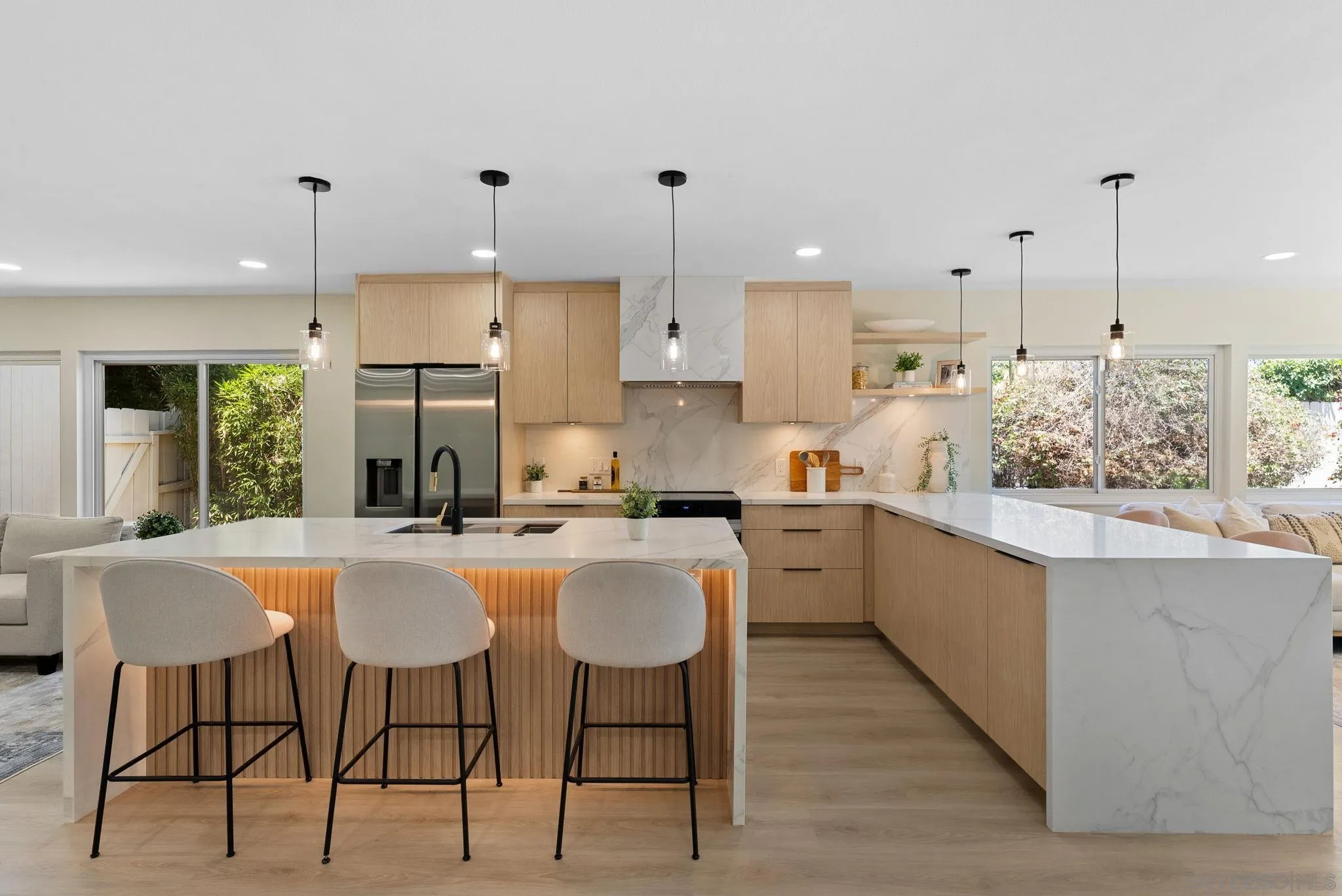 Welcome to this beautifully reimagined 5-bedroom, 3-bath residence--where designer detail and California comfort come together in perfect harmony. Step inside to a bright, open-concept living space that immediately impresses. At the heart of the home is a showstopping chef's kitchen, complete with white oak cabinetry, waterfall-edge quartz countertops, and a stunning statement backsplash. A full suite of premium stainless-steel appliances and an oversized island with pendant lighting make it the ideal space for cooking, gathering, and entertaining. The kitchen flows seamlessly into the dining and living areas, framed by expansive glass sliders that open to a lushly landscaped backyard--creating the ultimate indoor-outdoor connection. Wide-plank luxury vinyl flooring runs throughout, adding warmth and sophistication to the modern design palette. Every bathroom in the home has been fully transformed with designer tilework, floating vanities, and contemporary fixtures that elevate everyday living. With five bedrooms, there's space for family, guests, or a dedicated home office. Set on a peaceful street in one of Rancho Bernardo's most desirable neighborhoods, this turnkey home offers convenience to award-winning schools, shopping, dining, golf courses, and parks. Stylish. Spacious. Move-in ready. This is the modern Rancho Bernardo lifestyle at its best.