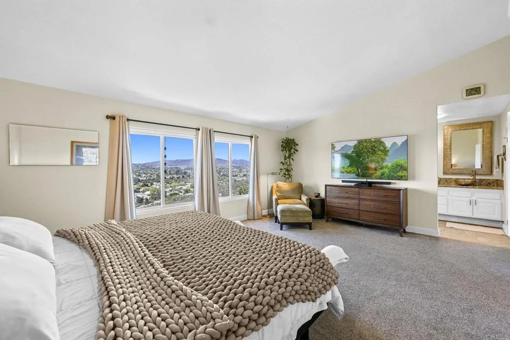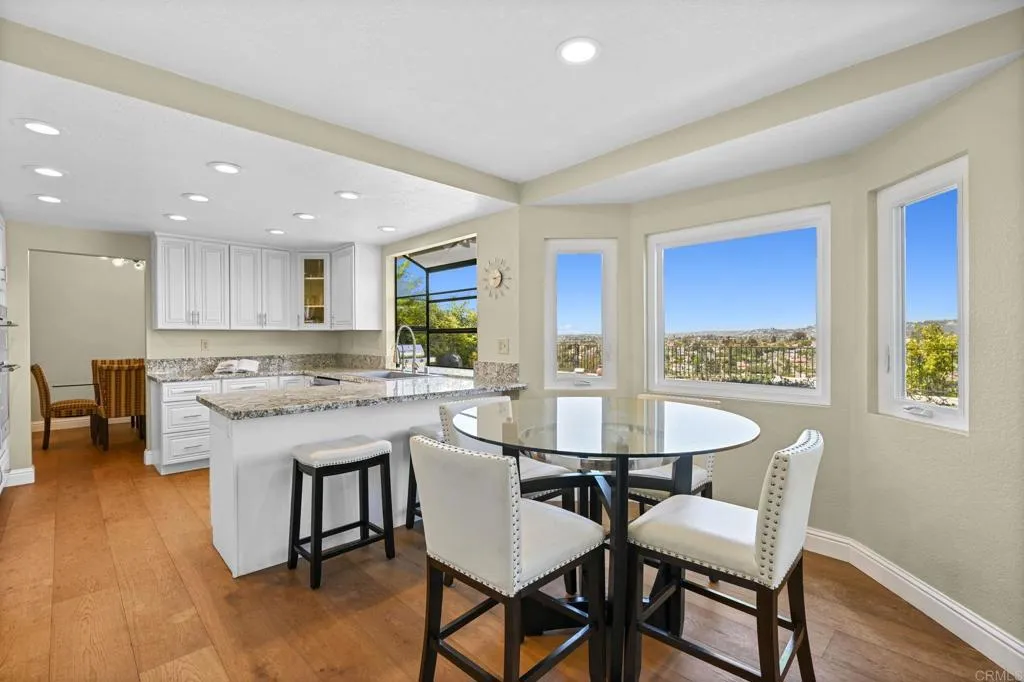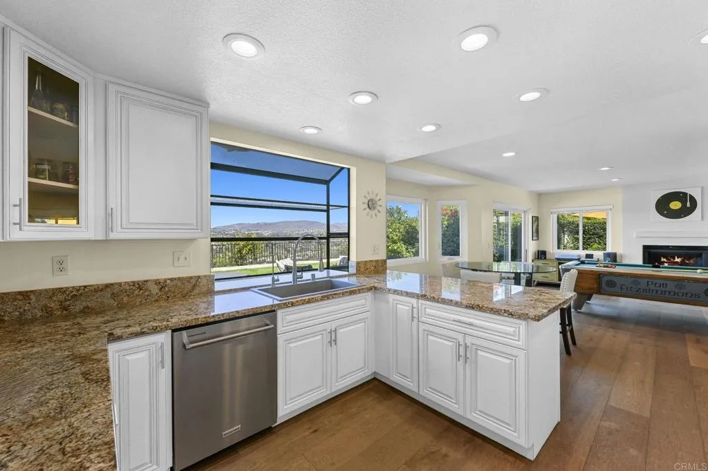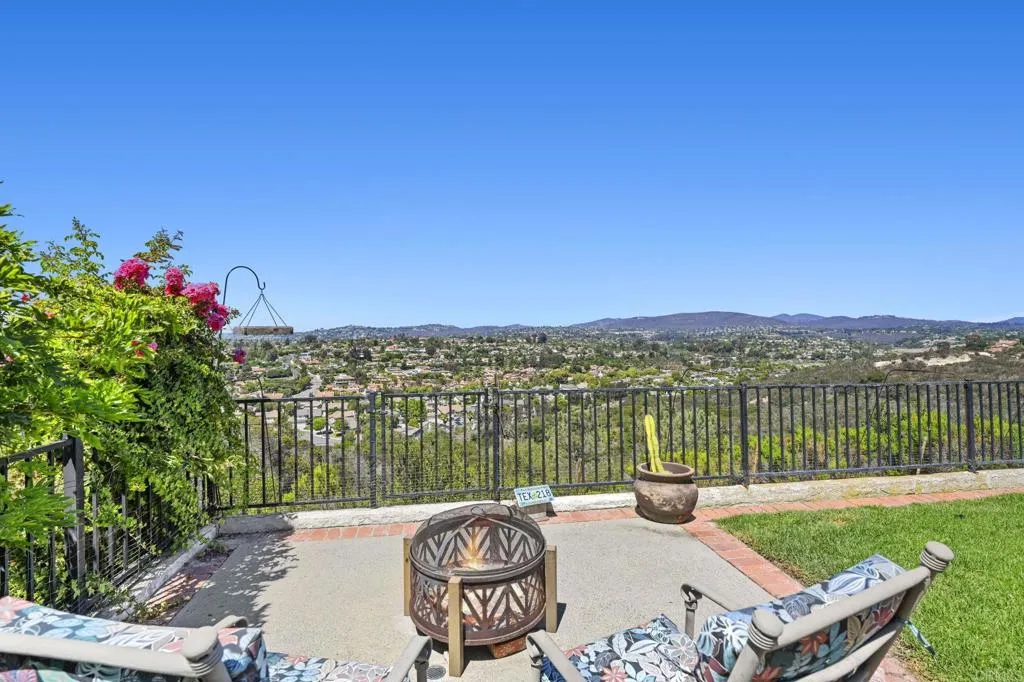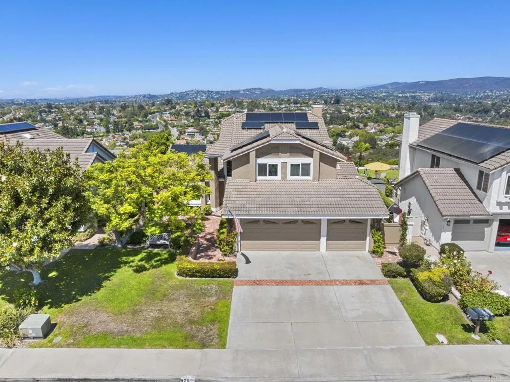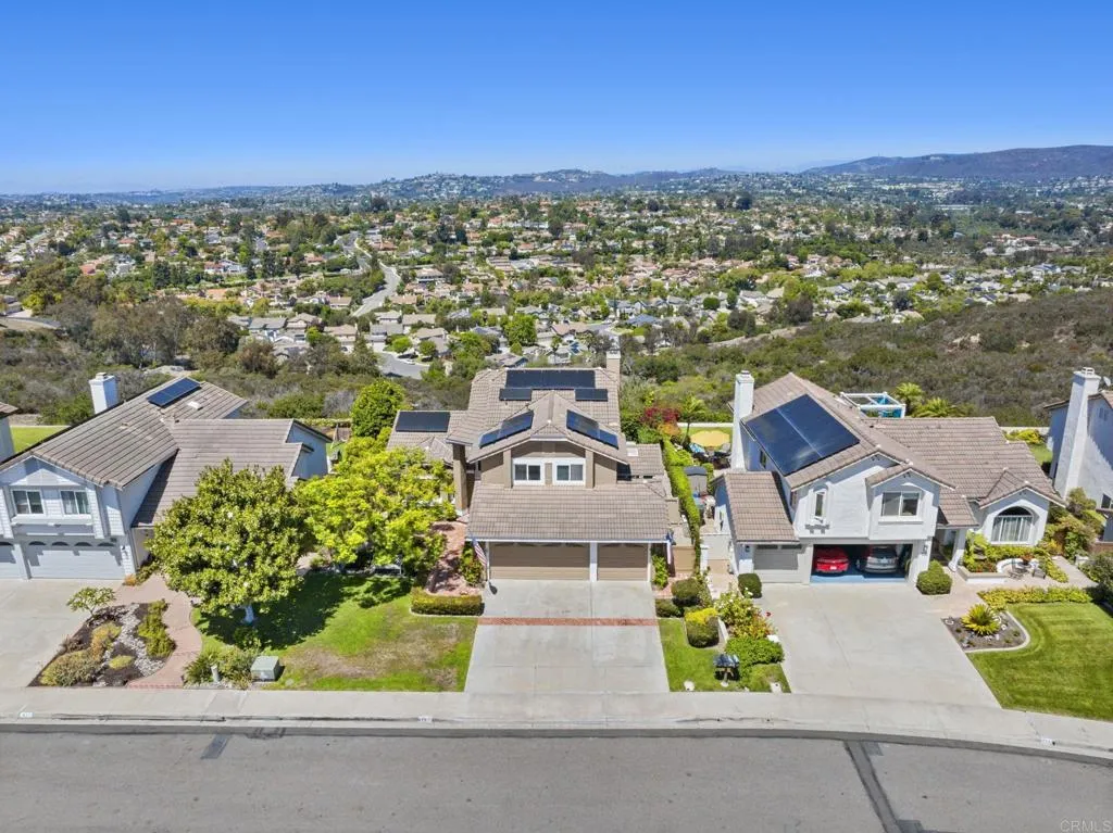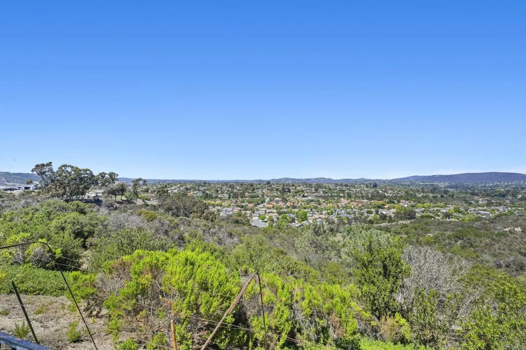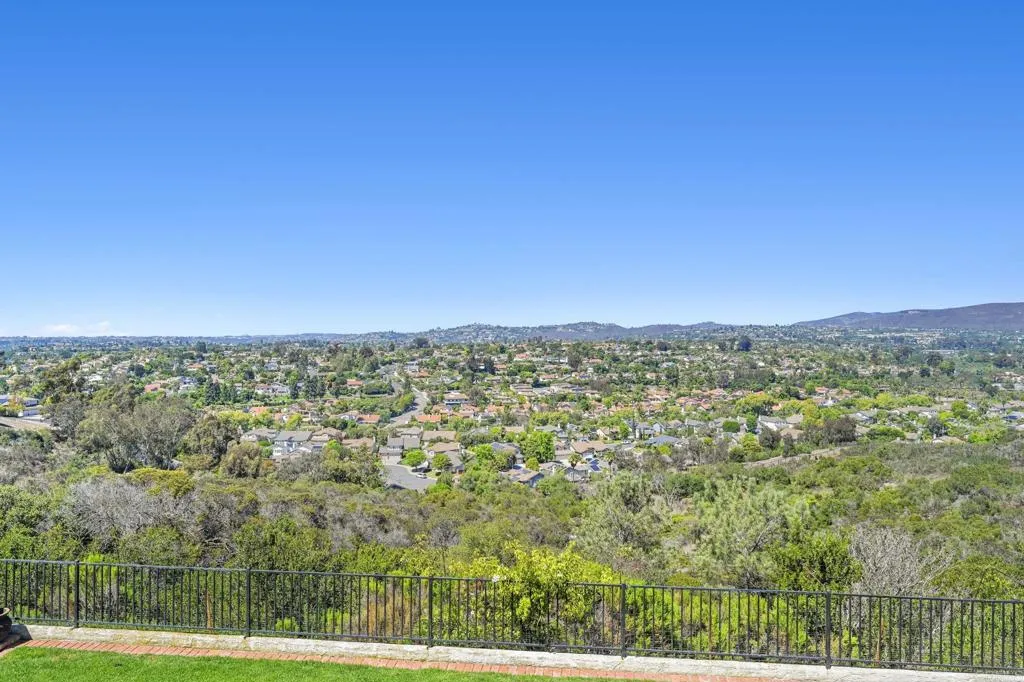 Perched on one of Encinitas highest vantage points, this home captures breathtaking panoramic views stretching north to Big Bear and surrounding peaks. A spacious open layout combines the kitchen and family room, complete with gas fireplace, upscale granite counters, newer neutral cabinetry, and a charming box bay window framing the view from the farm sink. French oak solid hardwood floors and a welcoming foyer set the tone. Convenient downstairs bedroom and full bath. Expansive primary suite offers double sinks, shower, and spectacular views. The 3-car garage provides ample space for projects, workbench, and storage, while the large driveway accommodates extra parking, all situated on a culdesac streeet. The backyard is an entertainers dream with room for a vanishing-edge pool, newly serviced above-ground spa, 15 solar panels, and two patios perfect for relaxing and soaking in the scenery. A rare opportunity to enjoy unmatched views and versatile living in Encinitas. This is more than a homeits a rare opportunity to live above it all, where refined interiors meet awe-inspiring views.