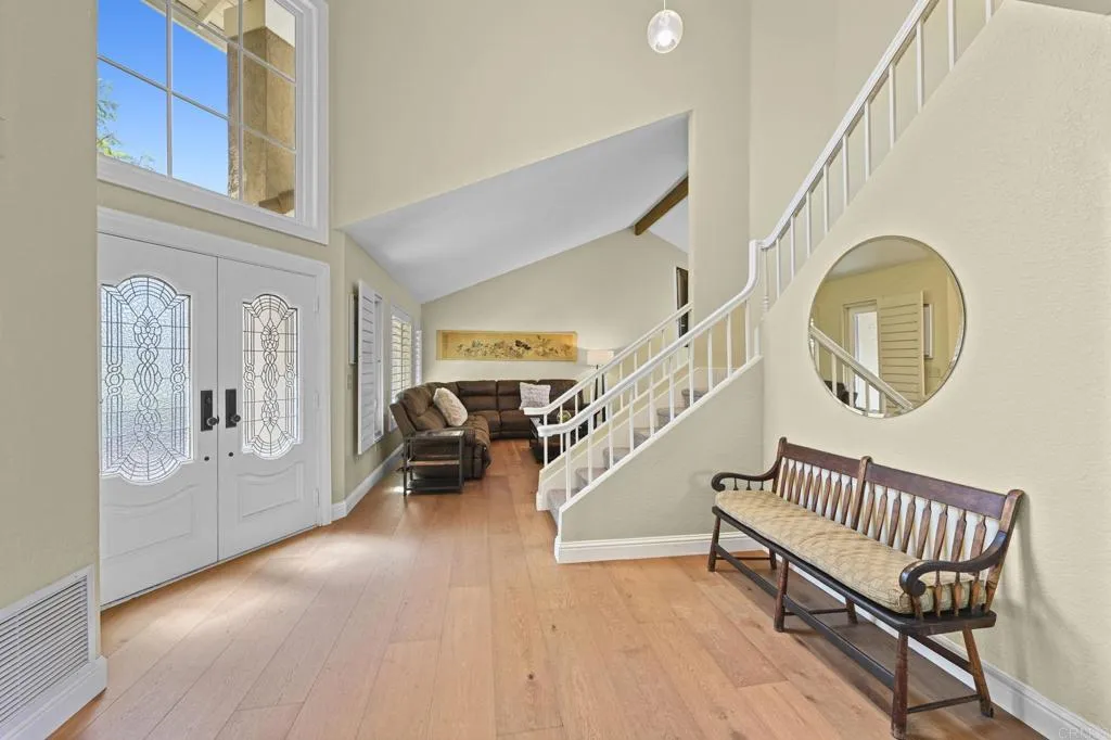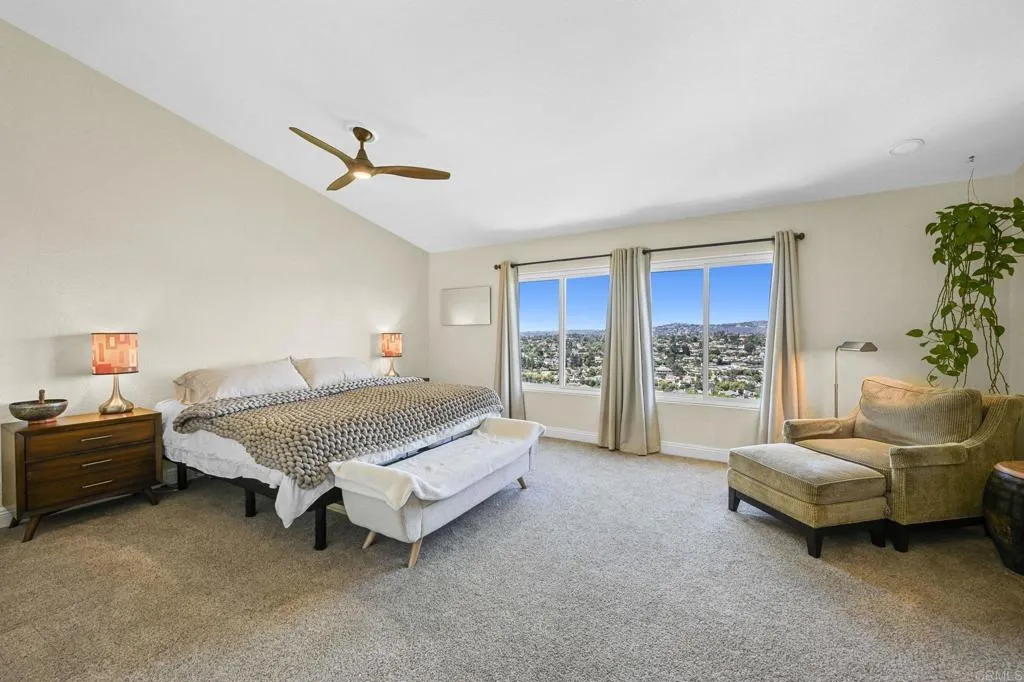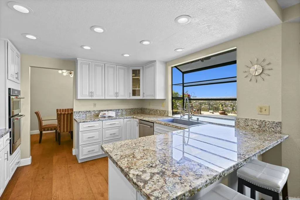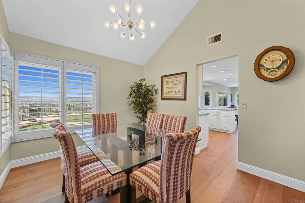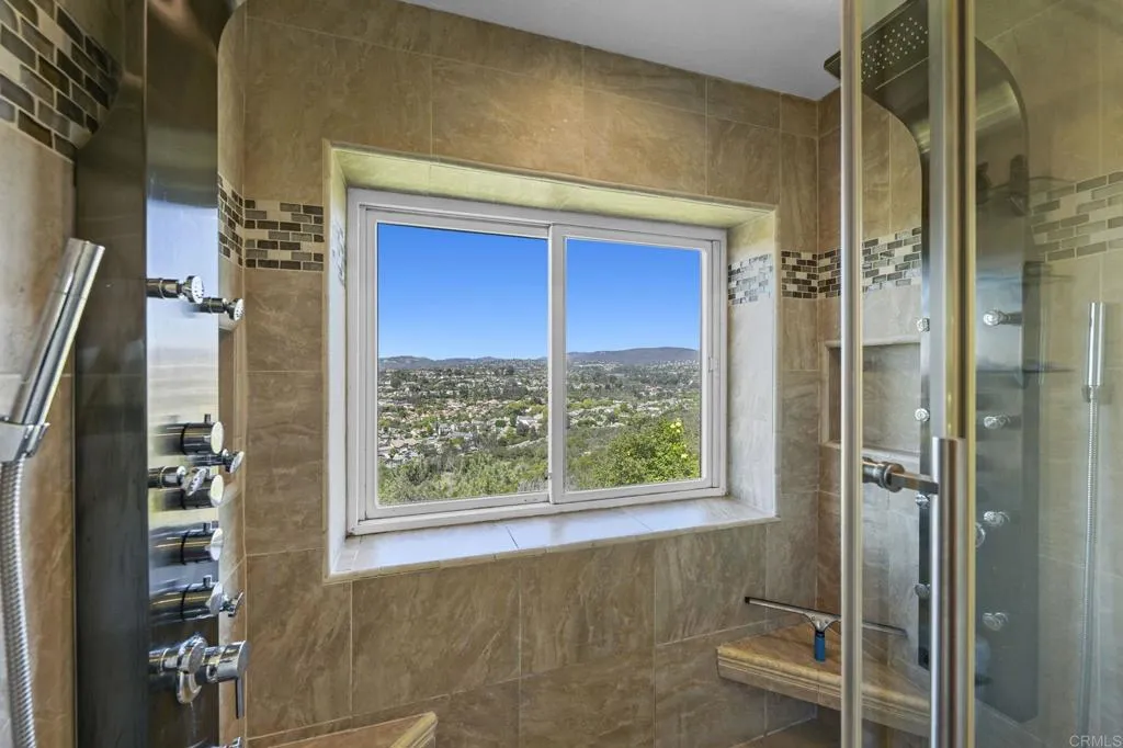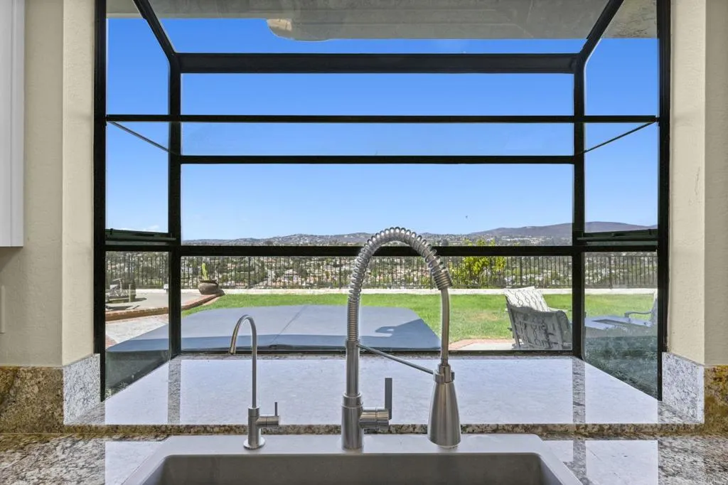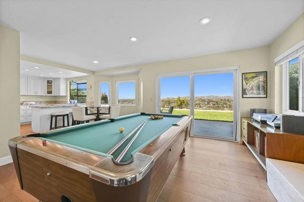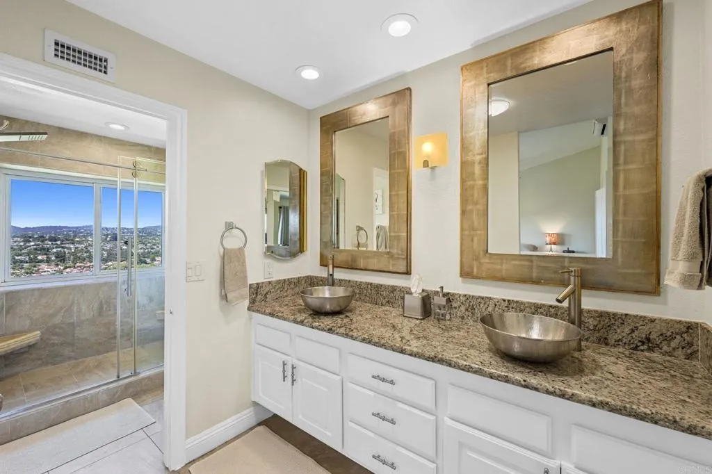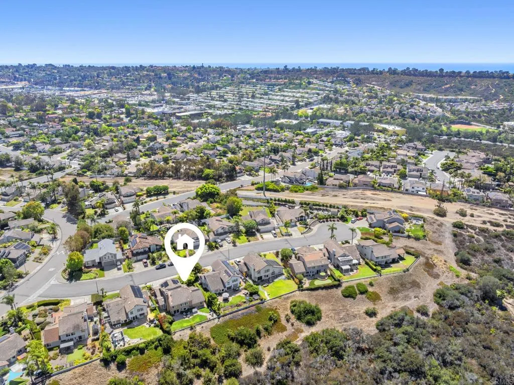 Perched on one of Encinitas highest vantage points, this home captures breathtaking panoramic views stretching north to Big Bear and surrounding peaks. A spacious open layout combines the kitchen and family room, complete with gas fireplace, upscale granite counters, newer neutral cabinetry, and a charming box bay window framing the view from the farm sink. French oak solid hardwood floors and a welcoming foyer set the tone. Convenient downstairs bedroom and full bath. Expansive primary suite offers double sinks, shower, and spectacular views. The 3-car garage provides ample space for projects, workbench, and storage, while the large driveway accommodates extra parking, all situated on a culdesac streeet. The backyard is an entertainers dream with room for a vanishing-edge pool, newly serviced above-ground spa, 15 solar panels, and two patios perfect for relaxing and soaking in the scenery. A rare opportunity to enjoy unmatched views and versatile living in Encinitas. This is more than a homeits a rare opportunity to live above it all, where refined interiors meet awe-inspiring views.